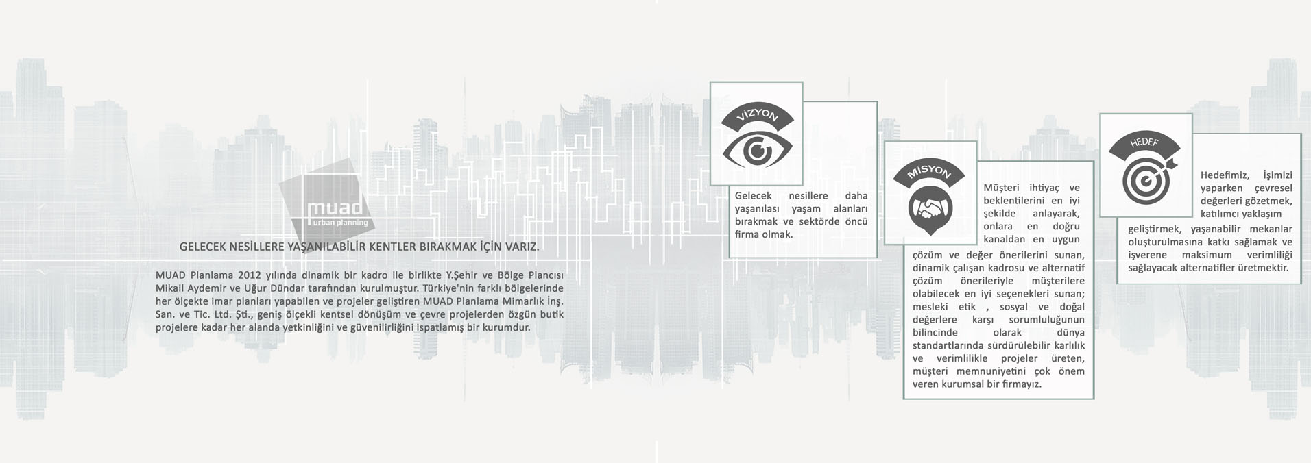 Gelecek nesillere yaşanılabilir kentler bırakmak için varız. MUAD Planlama 2012 yılında dinamik bir kadro ile birlikte Y.Şehir ve Bölge Plancısı Mikail Aydemir ve Uğur Dündar tarafından kurulmuştur. Hedefimiz, İşimizi yaparken çevresel değerleri gözetmek, katılımcı yaklaşım geliştirmek, yaşanabilir mekanlar oluşturulmasına katkı sağlamak ve işverene maksimum verimliliği sağlayacak alternatifler üretmektir.