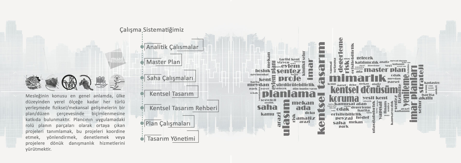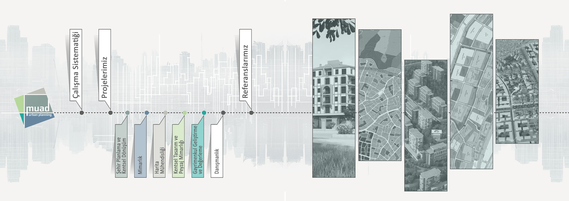 Türkiye'nin farklı bölgelerinde her ölçekte imar planları yapabilen ve projeler geliştiren MUAD Planlama Mimarlık İnş. San. ve Tic. Ltd. Şti., geniş ölçekli kentsel dönüşüm ve çevre projelerden özgün butik projelere kadar her alanda yetkinliğini ve güvenilirliğini ispatlamış bir kurumdur.