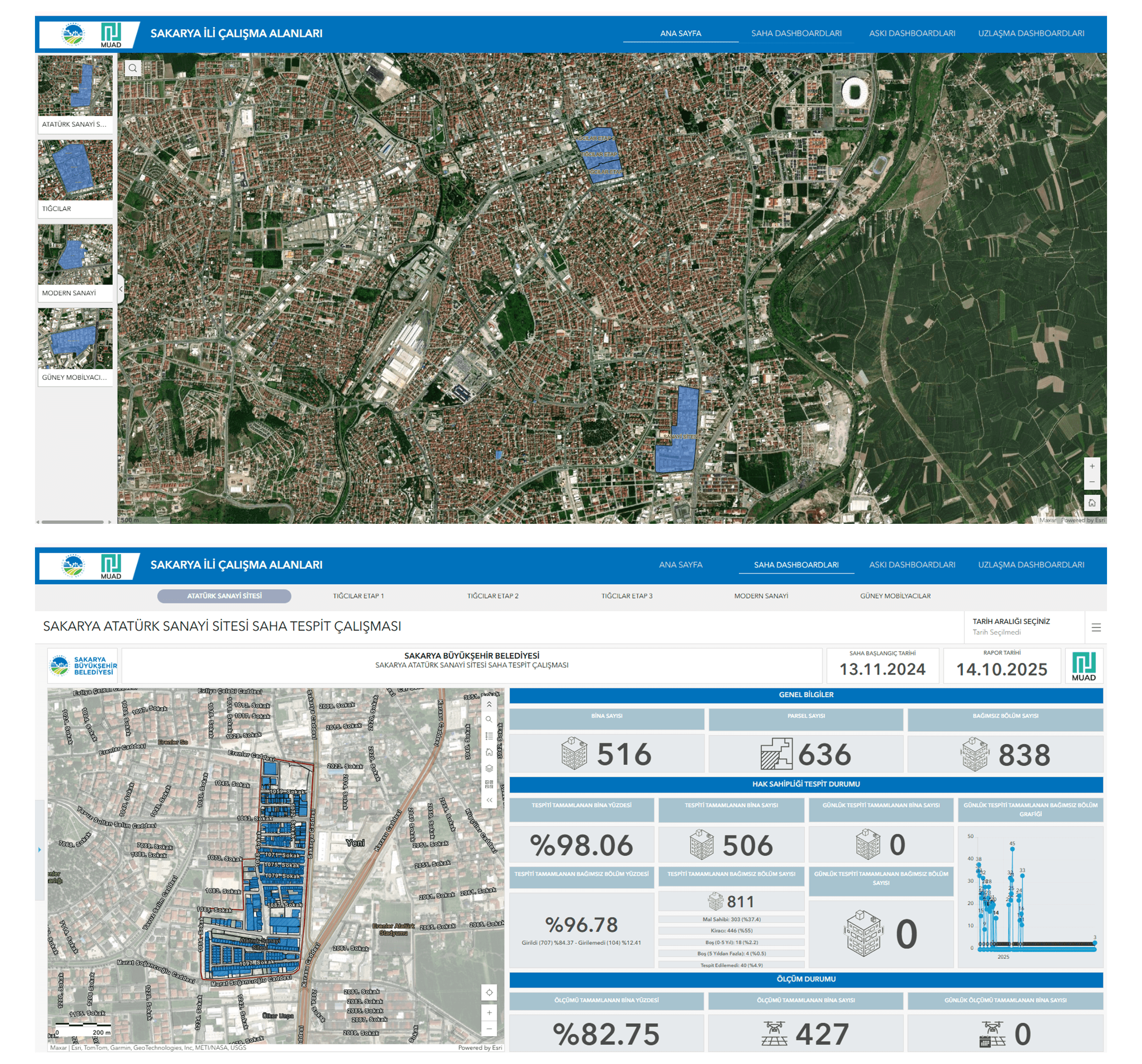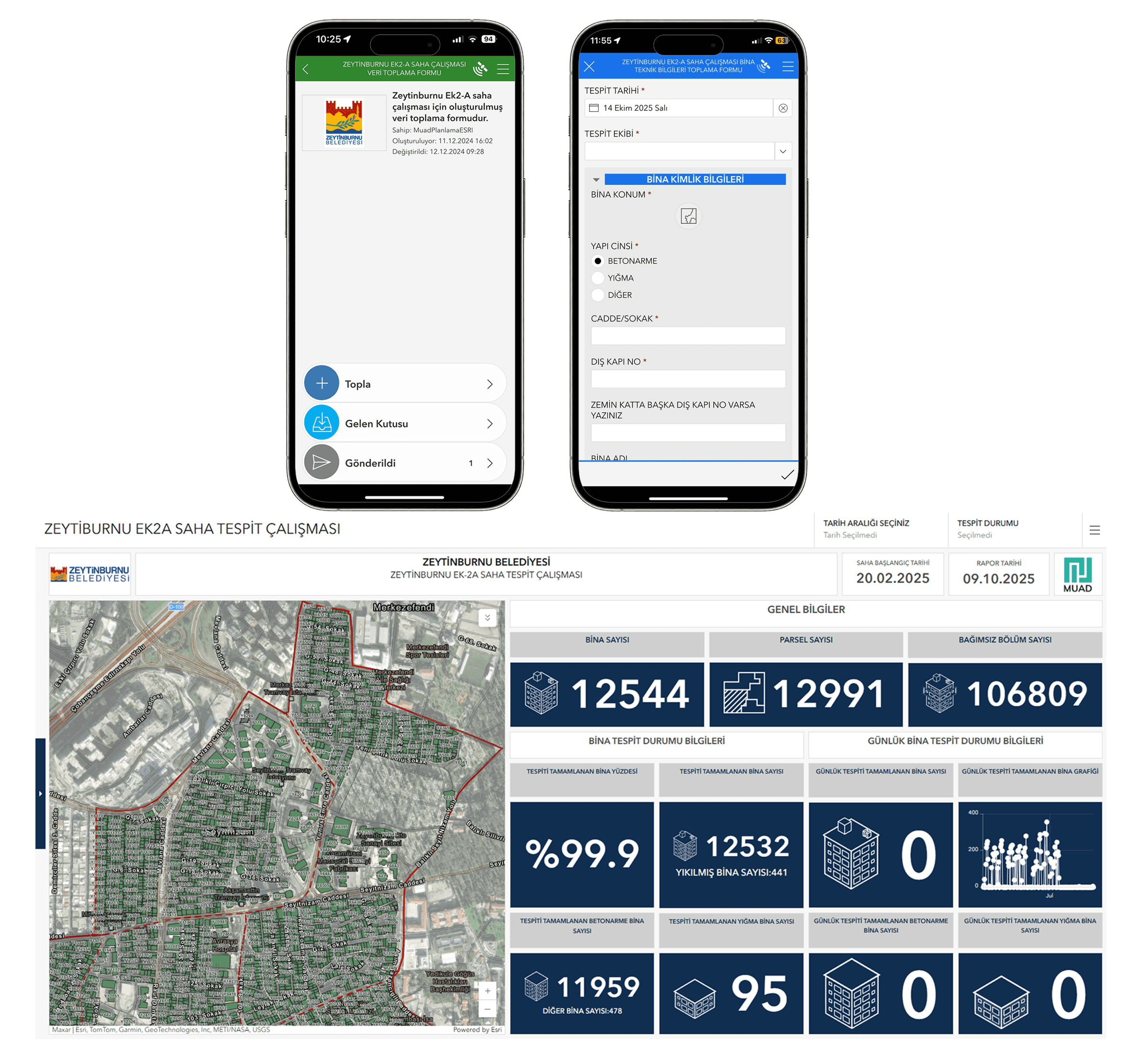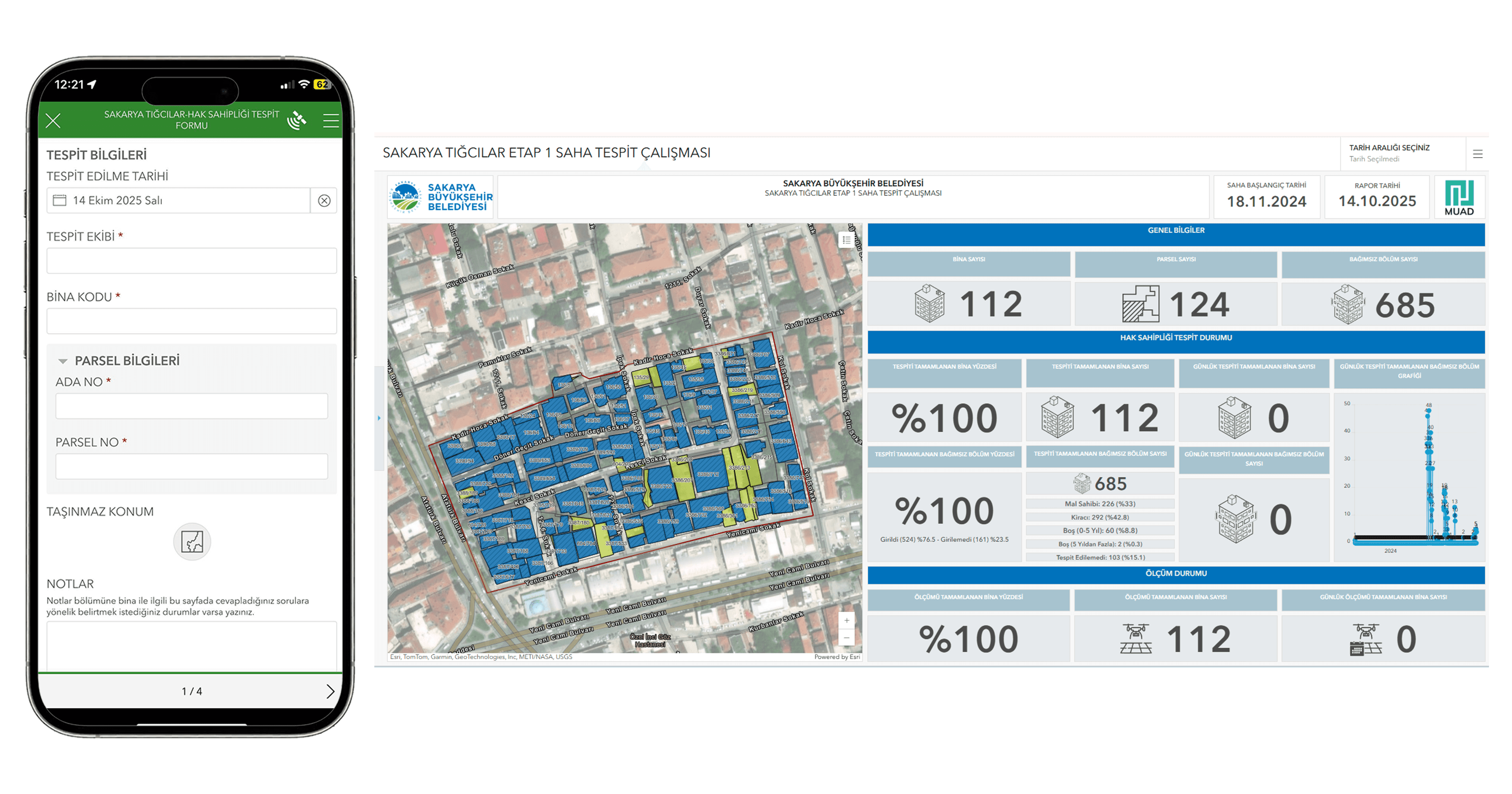 MUAD olarak, kentsel dönüşüm projelerinin tüm aşamalarında dijitalleşmeyi ve mekânsal yönetimi destekleyen gelişmiş CBS çözümleri sunuyoruz. Sahadan alınan veriler mobil uygulamalar aracılığıyla toplanır ve anlık olarak merkezi CBS altyapısına entegre edilir. Kullanıcılar, web tabanlı dashboardlar üzerinden harita ve infografiklerle süreçleri takip edebilir ve müdahalelerde bulunabilir.